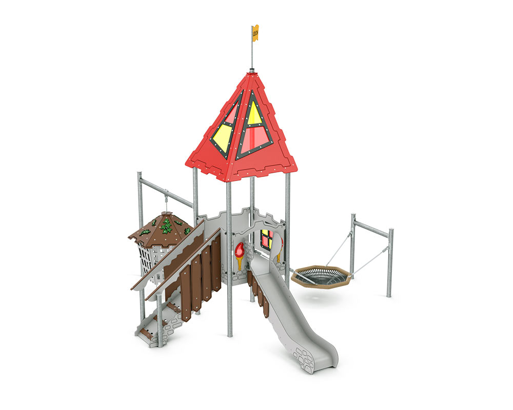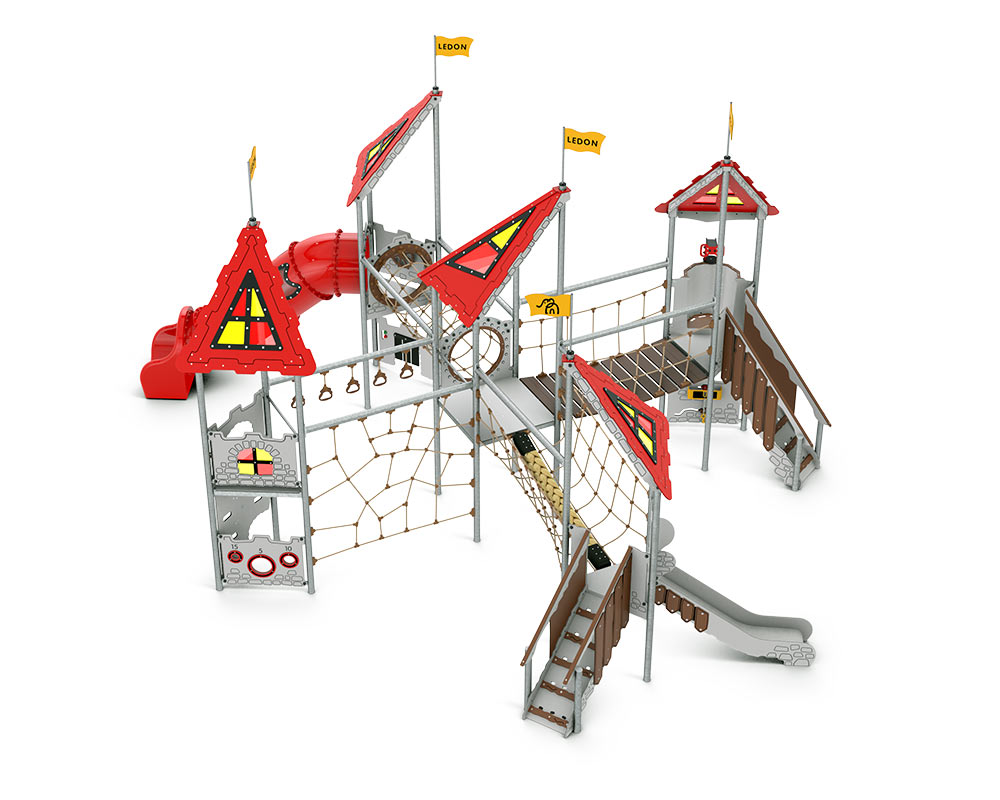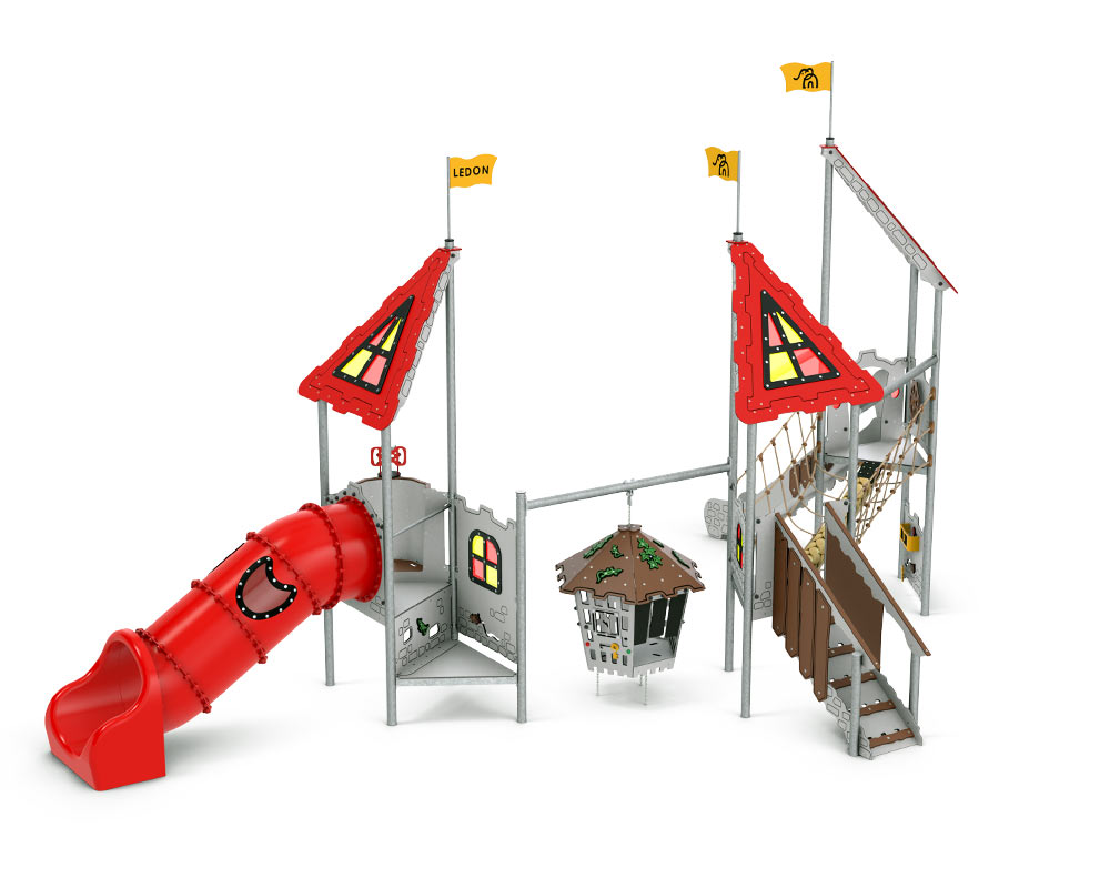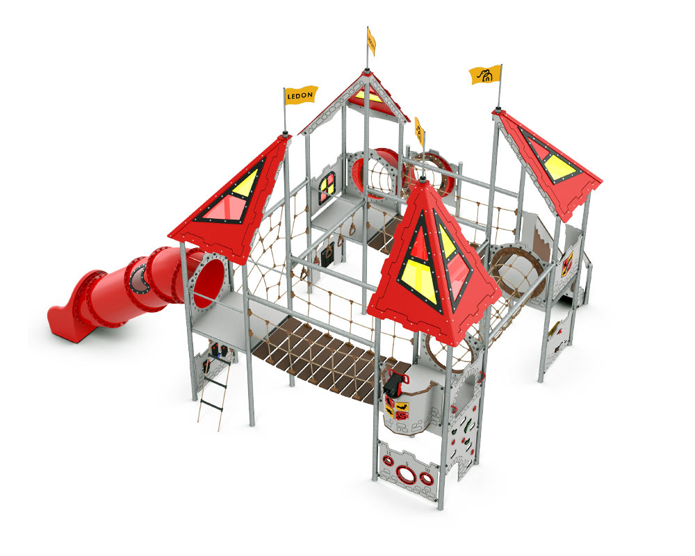 Auf einer Ritterburg sind wachsame Augen und Scharfsinn gefragt – mutige Ritter und clevere Burgfräuleins sichern die Anlagen. LEDON Castle versetzt die Kinder zurück in das geheimnisvolle Mittelalter. Die Burg muss geschützt werden, sind ungebetene Gäste im Anmarsch, auch die Versorgung muss gesichert werden – der Fantasie sind keine Grenzen gesetzt. Viele liebevoll gestaltete Details wie farbige Fenster, bewegliche Teile wie Schatzschlüssel, Fernglas, Wappen usw., Hütten oder komplette Spielpaneele fördern Motorik und Interaktion. Es stehen 24 verschiedene Kombinationen zur Auswahl – ergänzt durch Federwipper und Trittsteine. Alle Geräte sind aus Stahl und Polyethylen hergestellt.